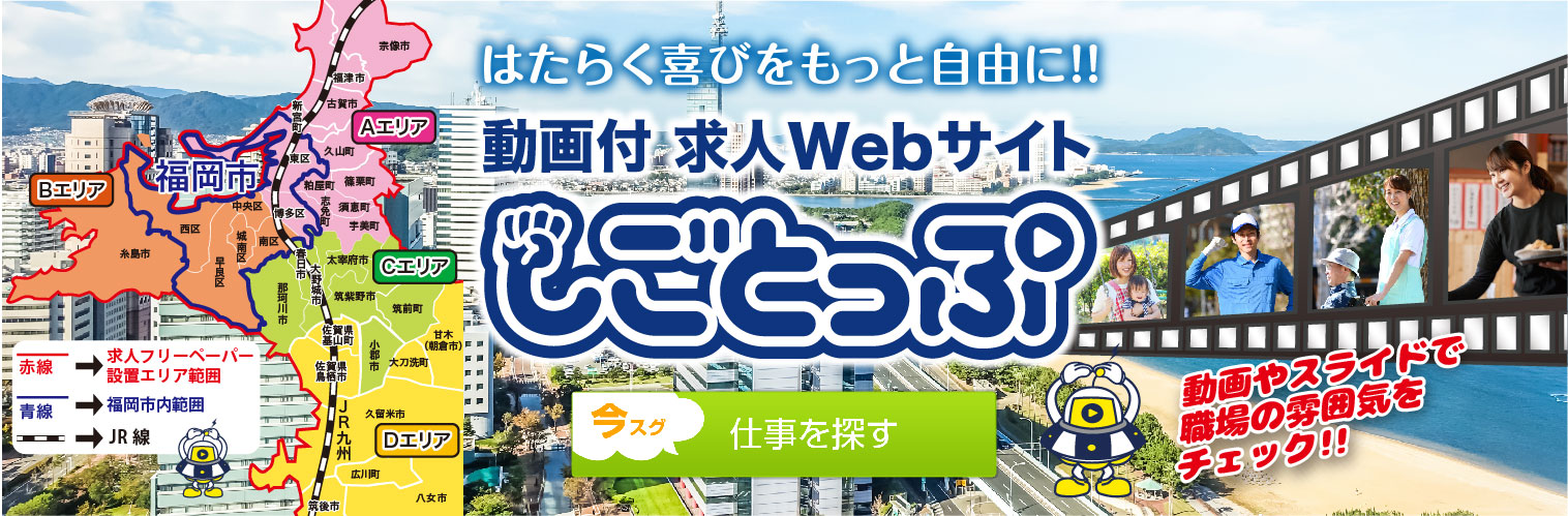 福岡都市圏版+福岡久留米・朝倉・近郊・佐賀県一部(鳥栖・基山)!更に掲載エリア拡大中!しごと探しは「しごとっぷ」