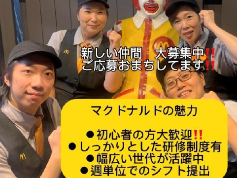 ☆マッククルー選べる4職種大募集! ①デリバリー商品配達・配送 ②注文受付・接客 ③フロア・ご案内 ④キッチン・調理補助 初めてのバイトデビューや高校生の応募もOK! シニア・学生・主婦(夫)・フリーター等様々な年代が活躍しています。 <簡単作業だから未経験でも始めやすい!> 未経験の方もしっかりと初心者研修を行いますのでご安心ください♪ マクドナルドが初めてのアルバイトデビューのスタッフも多数◎ |
